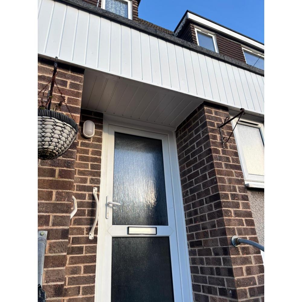 The new soffit was installed within one working day, providing a stronger, safer and significantly improved entrance. The clean white uPVC finish delivers long-term weather resistance, reduced maintenance needs and a more modern appearance. The property now benefits from a tidy and fully protected entrance area.